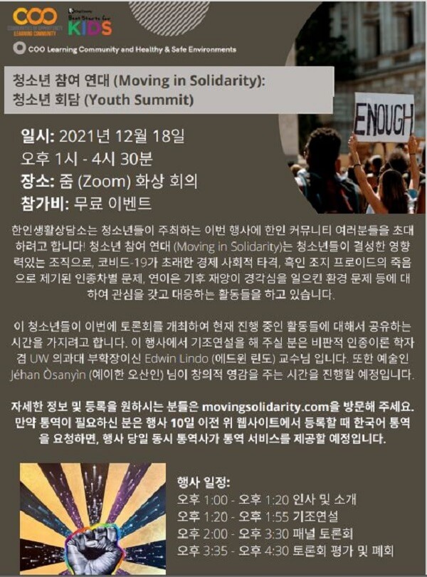 청소년 참여연대(Moving in Solidarity)는 청소년들이 결성한 단체로 코비드-19가 초래한 경제적 타격과 인종차별 및 기후 변화 등 전반적인 사회 문제에 대응하는 […]