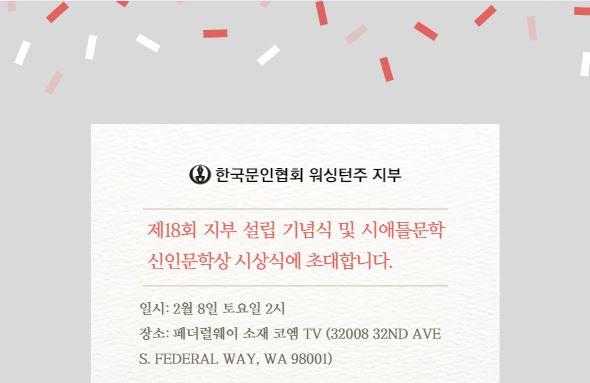 한국문인협회 워싱턴주 지부(회장 박보라)가 2월 8일 토요일로 예정했던 제18회 설립기념식 및 신구 회장 이, 취임식 그리고 시애틀문학신인문학상 시상식이 2월 22일 […]