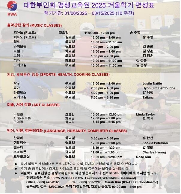 대한부인회 평생교육원(원장 켈리 류)은 오는 1월 6일부터 3월 15일까지 레이크우드에 위치한 교육원 본원(3625 Perkins Ln SW, Lakewood, WA 98499)에서 겨울 […]