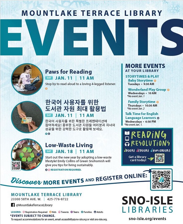 오는 1월 11일 토요일 오전 11시에 마운틴레이크 테라스 도서관(Mountlake Terrace Library)에서는 한국어 사용자를 위한 도서관 자원 최대활용법에 대한 프레젠테이션이 개최된다. […]