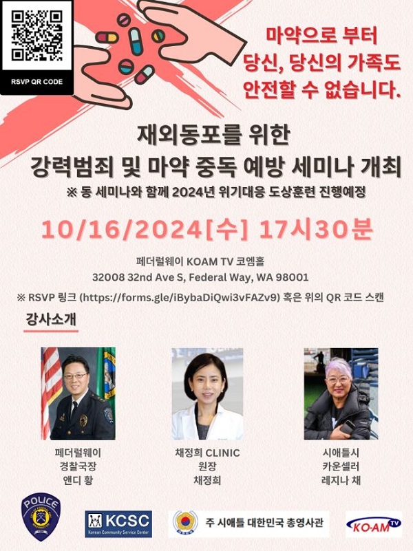 주시애틀총영사관은 매년 재외동포들의 안전을 높이기 위해 세미나를 개최하며, 올해 ‘재외동포를 위한 강력범죄 및 마약 중독 예방 세미나’는 10월 16일 수요일에 […]