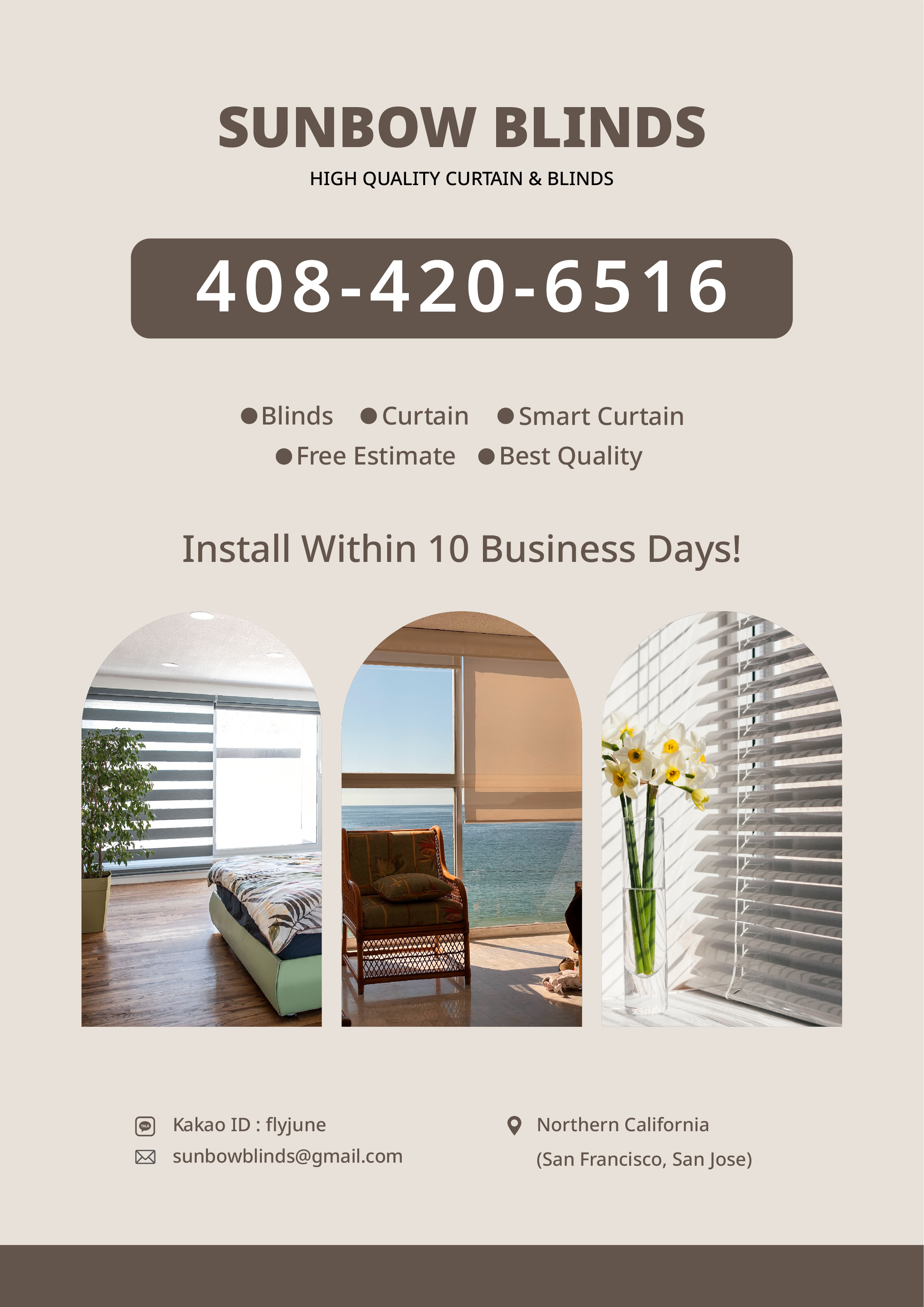 산호세에 사는 친구가 직접 해보고 만족해서 추천해 준 블라인드 업체가 있어요. 저도 견적을 받아보니 The Shade Store에서 받은 가격의 55프로 정도로 견적을 주셨어요. 블라인드는 한국산입니다. 업체는 산호세에 있는데, 벨뷰에 있는 저희 집까지 직접 두 번이나 오셔서 치수 직접 재어 주시고, 상담 추천해 주시고, 설치하러 다시 오십니다. 제가 너무 감사한 마음에, 오시는 김에 다른 관심 있으신 분들도 연락이 되셔서 상담해주실 수 있으면 좋을 거 같아서 이렇게 추천을 드립니다. 관심 있으시면 Sunbow Blinds Tom Park (408-420-6516) 사장님께 연락하세요.