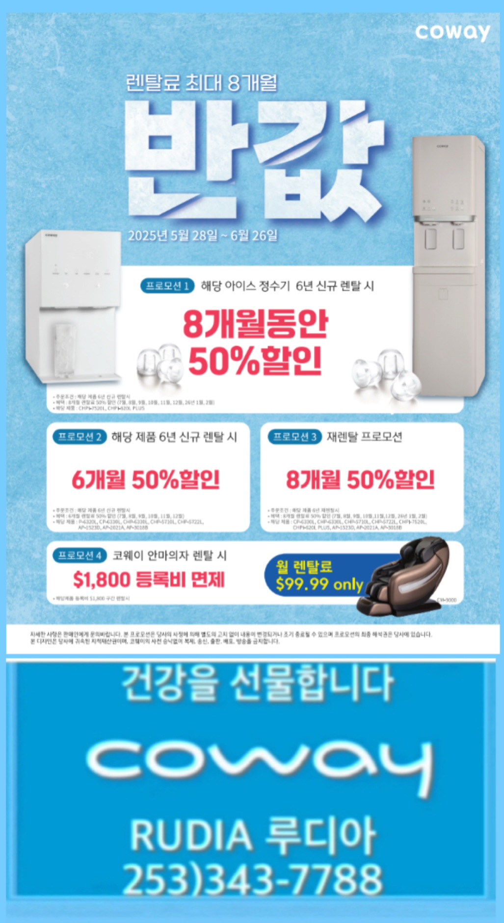 코웨이 6월 프로모션 안미의자 $1800불 할인, NEW 얼음정수기 8개월 50% 할인