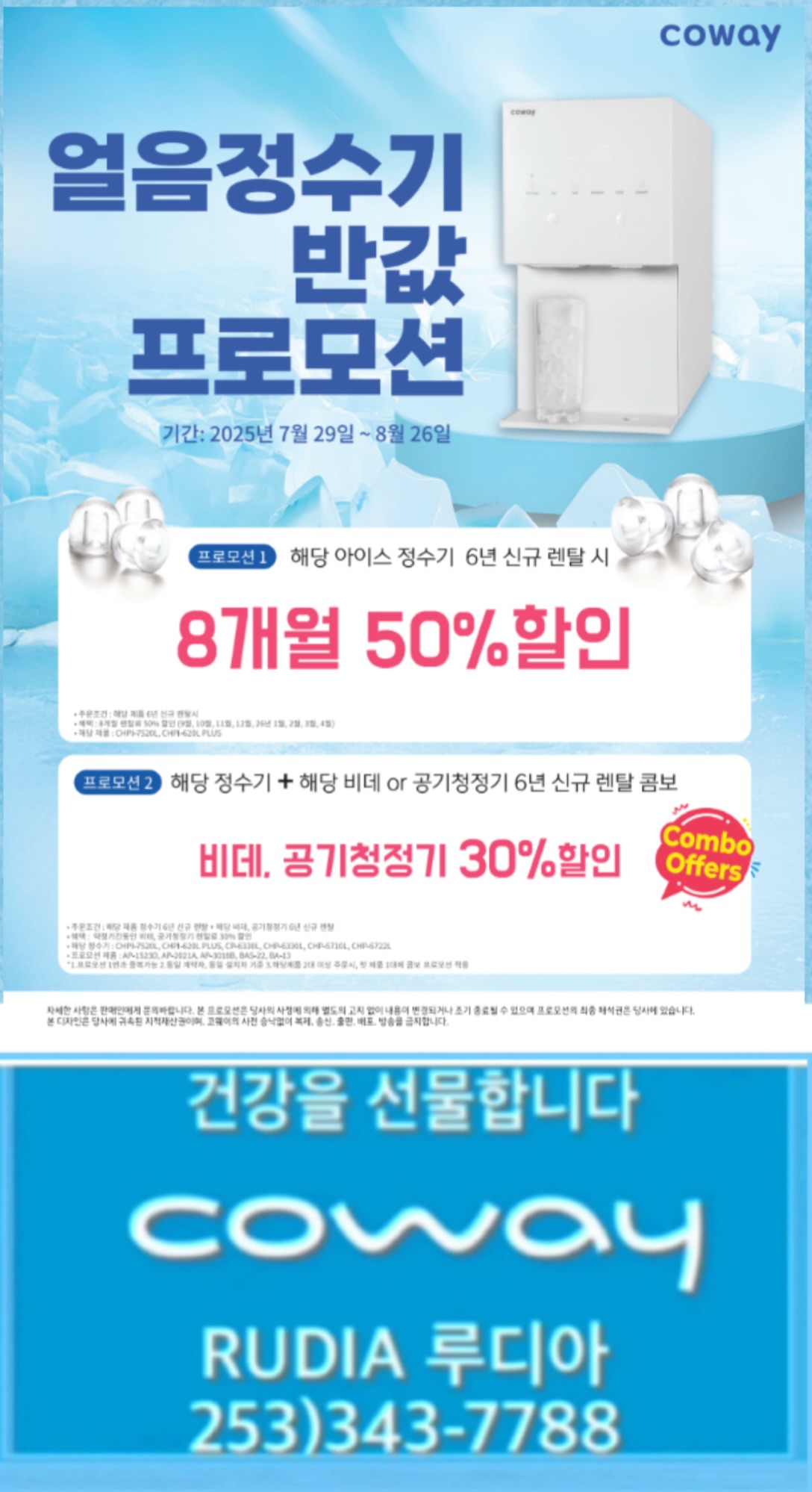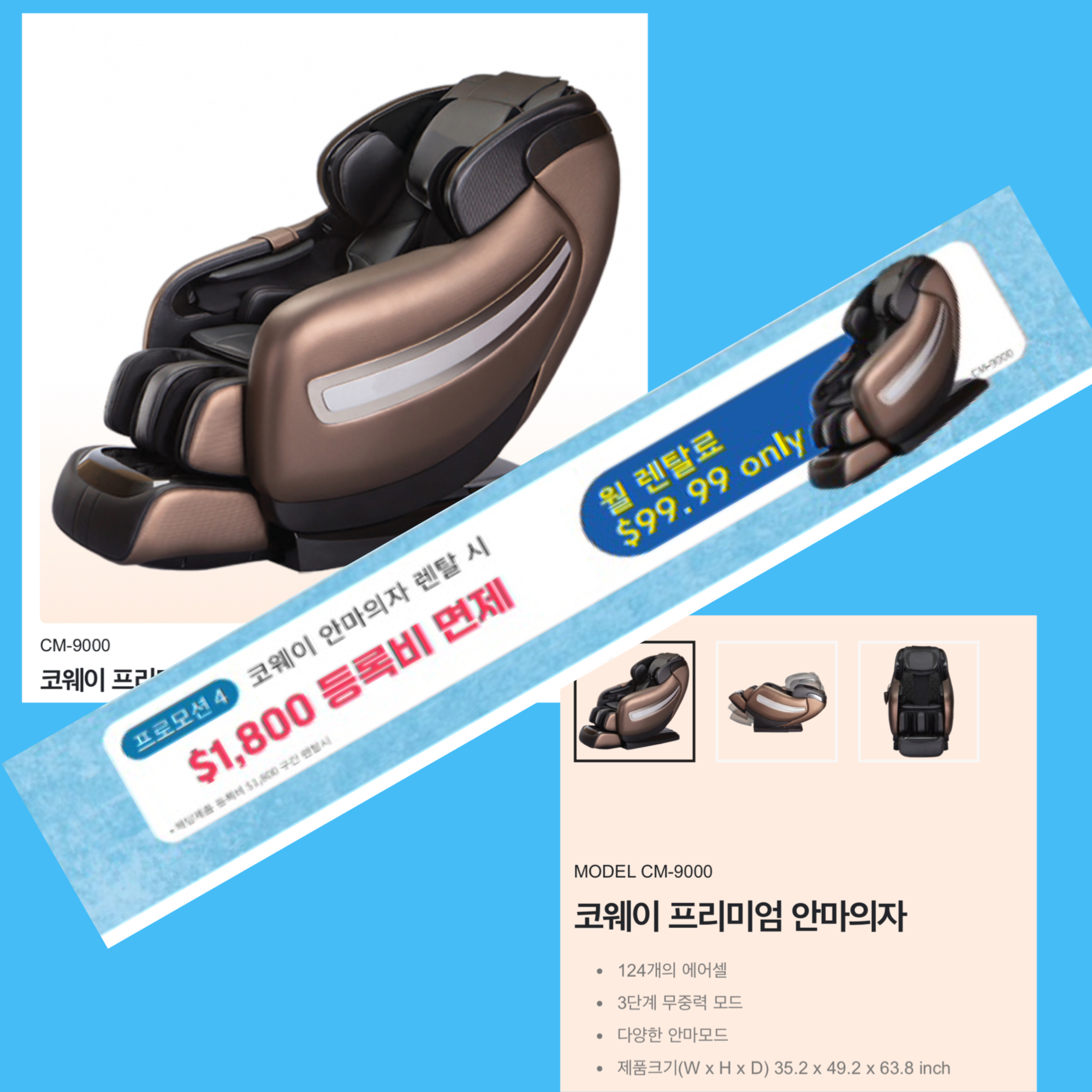 코웨이 8월 얼음정수기 반값 프로모션 & 안마의자 $ 1800 할인