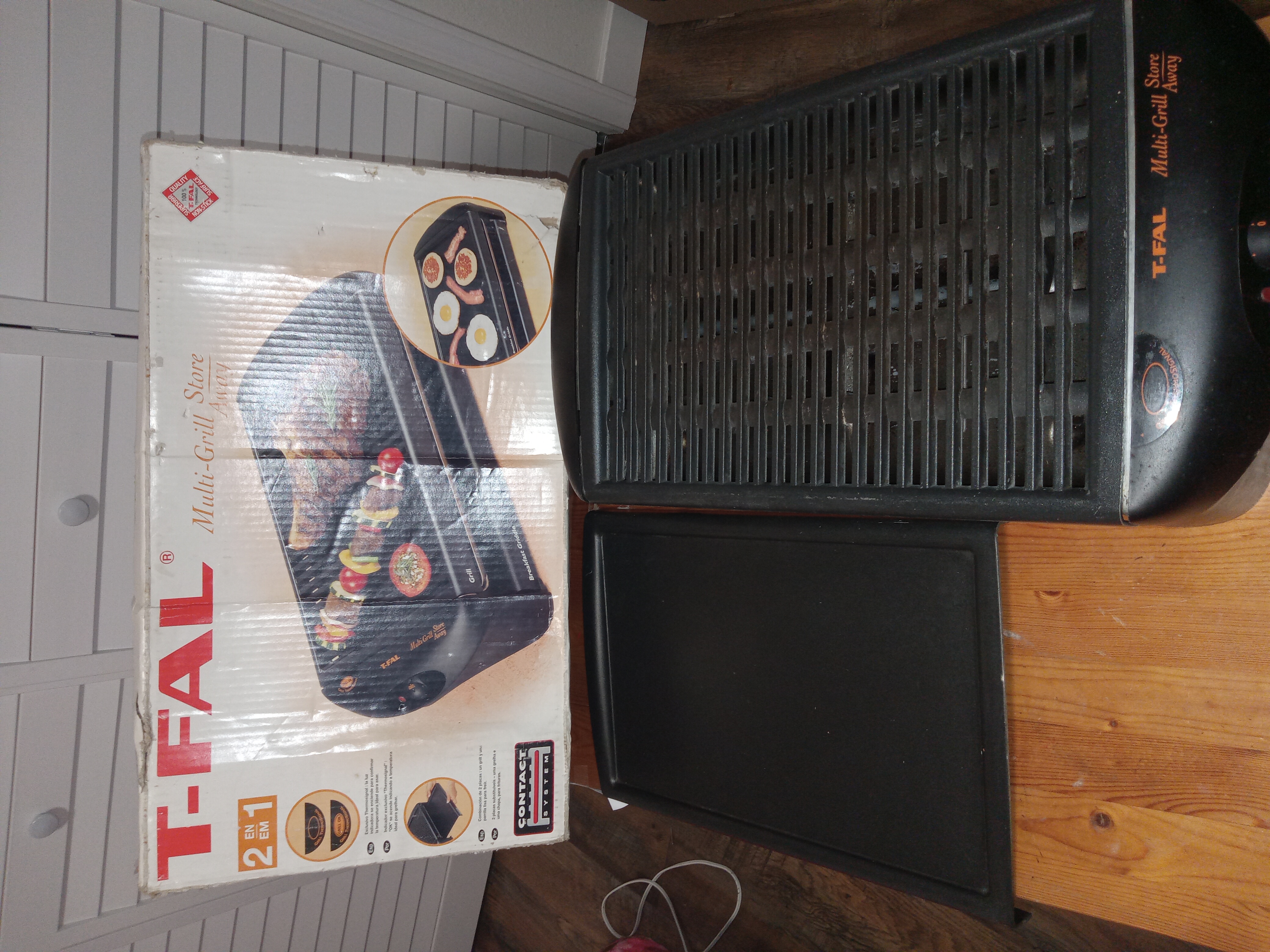 "T-fal Multi Grill Store Away 2-in-1" 제품은 기본적으로 그릴 플레이트(고기 굽는 요철이 있는 팬)와 평면 그리들 플레이트(팬케이크, 계란프라이용 민무늬 팬) 두 가지를 포함하고 있습니다. 사용안하는 플레이트를 본체 하단에 직접 보관(Store Away)할 수 있어 수납이 정말 깔끔합니다.깨끗하게 관리했으며, 플레이트 코팅 상태 좋습니다. 기름 받이가 따로 있어 세척도 간편해요.