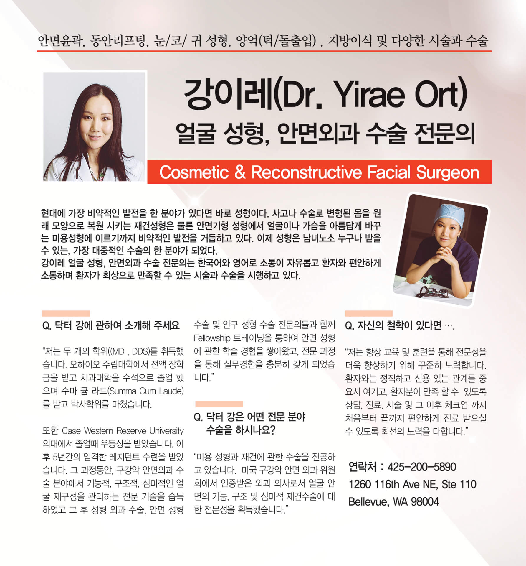 안면윤곽. 동안리프팅. 눈/코/ 귀 성형. 양억(턱/돌출입) . 지방이식 및 다양한 시술과 수술