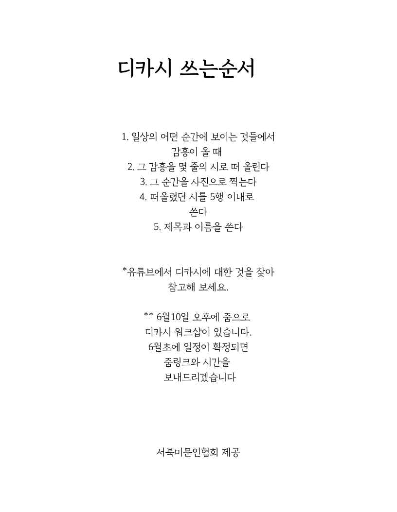 6월10일에 뿌리문학신인상부문 디카시 워크샵이 있어서 알려드립니다.