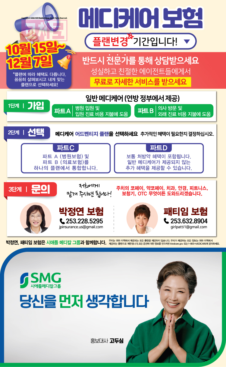 [패티임&박정연 보험] 메디케어 플랜 변경 기간입니다! 지금이 당신에게 딱 맞는 플랜을 찾을 최고의 기회입니다!