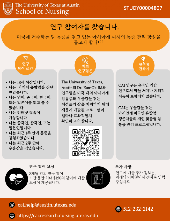 안녕하십니까, 저는 Texas Austin 대학교 간호학과에서 임은옥 교수님 (Dr. Eunok Im) 팀의 연구조교입니다. 저희는 현재 2가지 연구를 진행 중에 있습니다. 이 두 연구 모두 미주 한인들의 고충을 위한 대책을 마련하고자 하는 취지인 만큼, 많은 관심과 참여 부탁드립니다.