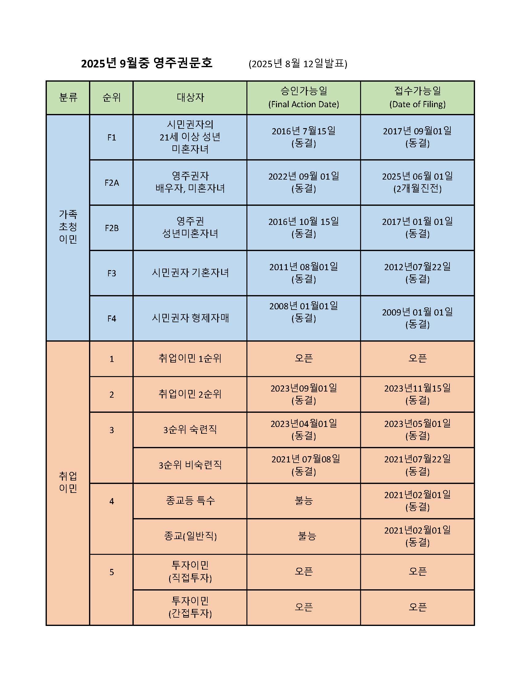 미국 국무부(DOS)는 8월 12일 2025년 9월중 영주권문호(Visa Bulletin)를 발표했습니다. 9월 영주권문호에서는 가족이민중 영주권자의 배우자와 미성년 자녀(F2A)의 접수가능일(Filing Date)만 2개월 진전되고 가족이민과 취업이민 승인가능일(Final Action Date)과 접수가능일(Filing Date)이 모두 지난달 문호에 머물렀습니다.