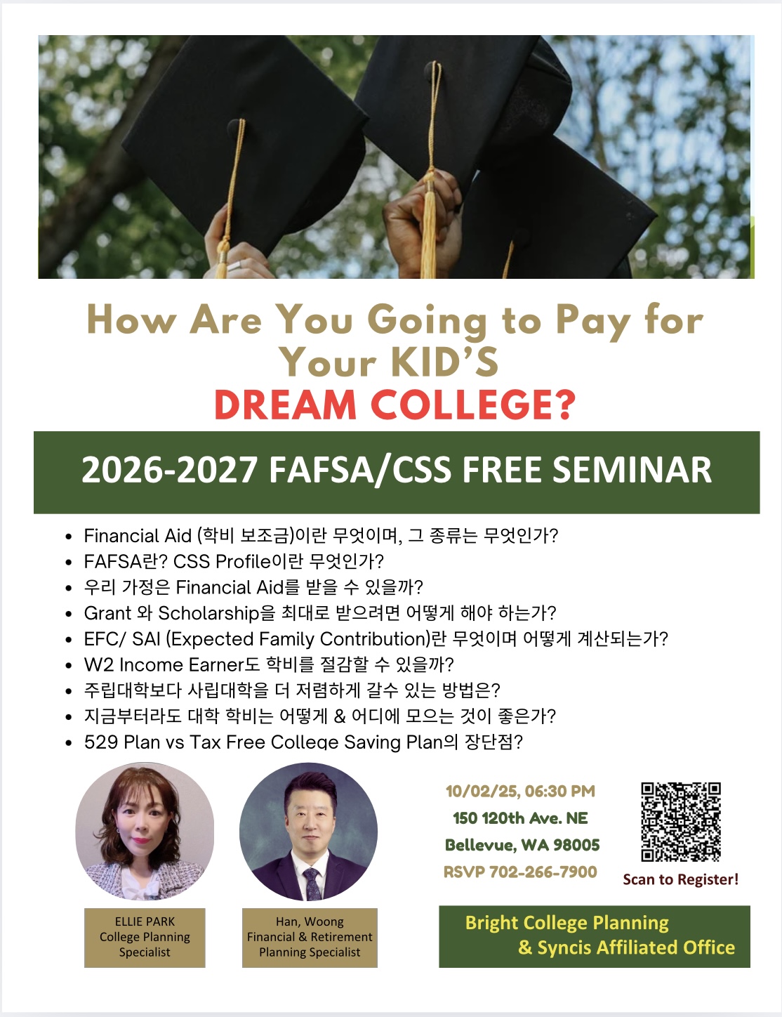 Bright College Planning에서 학자금 재정 세미나를 다음과 같이 개최합니다 ~