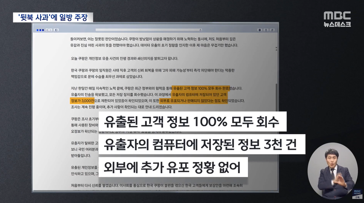 쿠팡은 “유출 데이터는 100% 회수됐다”며 “외부 유포도 없었다”고 주장했지만, 내부 조사 근거는 불투명합니다. 실제로 유출자 PC에 저장된 데이터가 3,000건뿐이었다는 설명엔 “피해 축소” 의혹이 이어집니다.