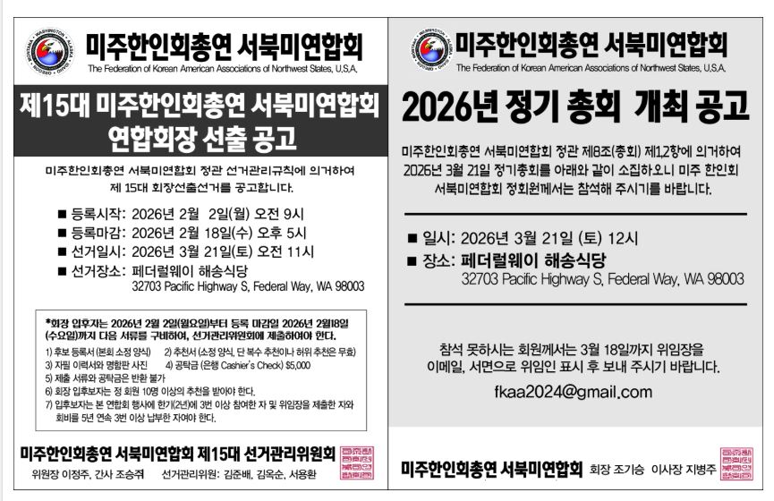 NEW 미주한인회총연 서북미연합회 2026년 정기 총회 개최 공고