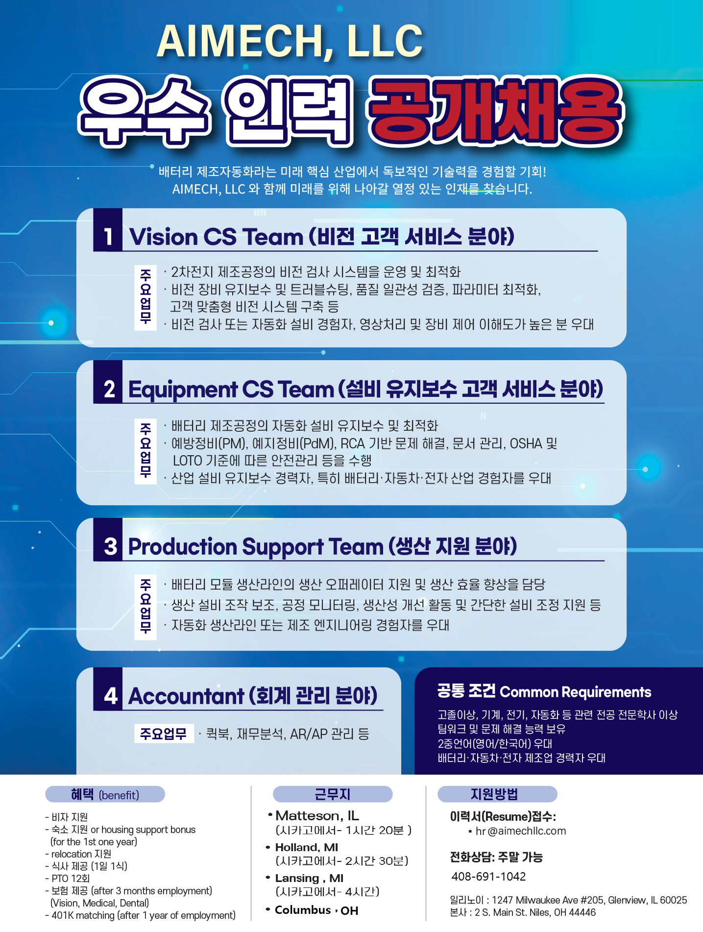 [구인]AIMECH USA, LLC에서 함께 일할 직원분을 찾고 있습니다.