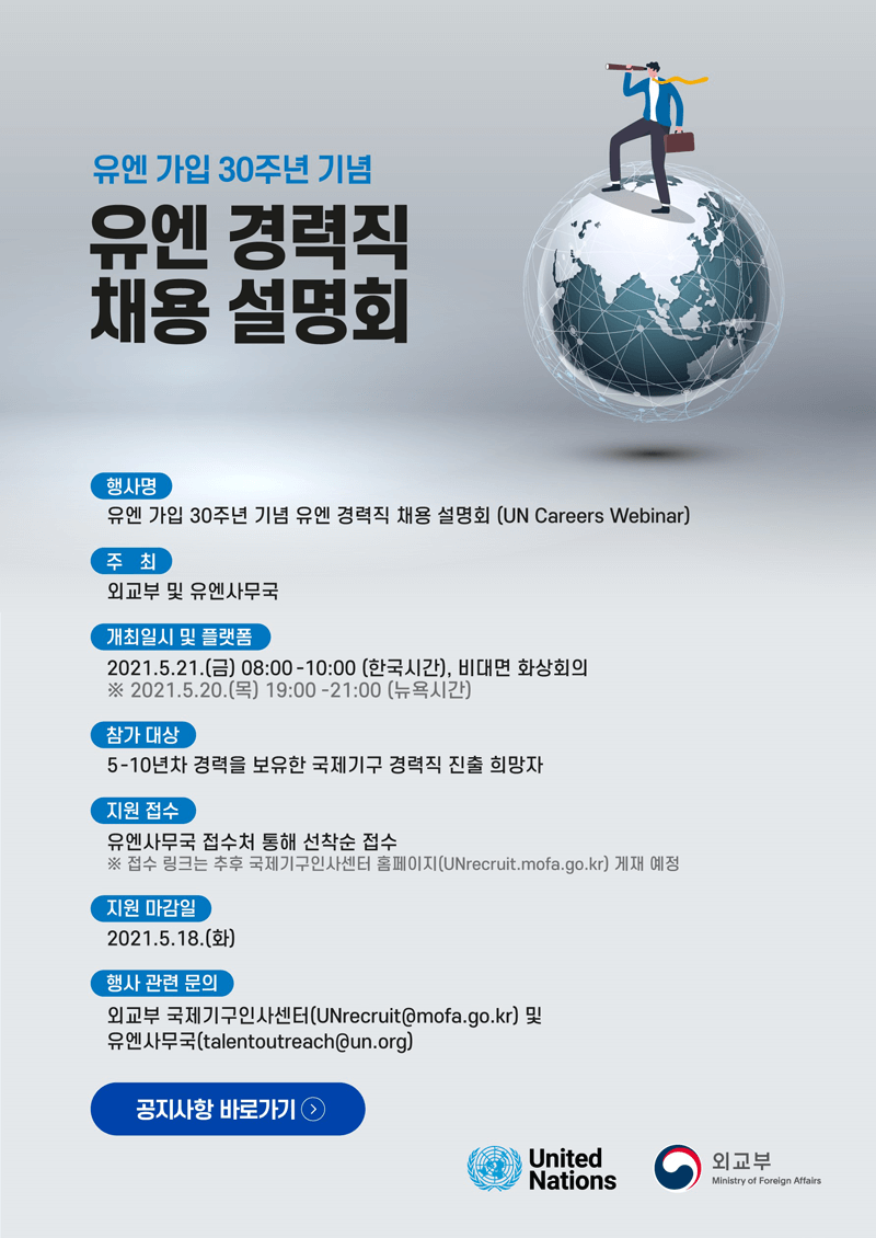 유엔 가입 30주년 기념 유엔 경력직 채용설명회 개최(5.21)