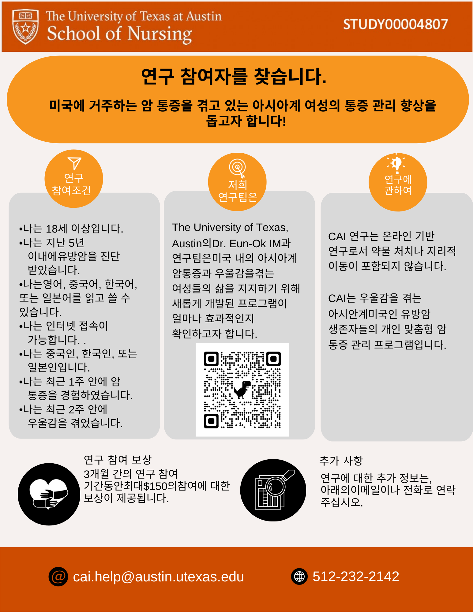 안녕하십니까, University of Texas at Austin 대학교 간호학과에서 임은옥 교수님 연구 팀에서는 미국에 거주하며 유방암을 진단받은 아시아 여성들을 대상으로 기술 기반의 정보 및 코칭/지지 프로그램 효과를 확인하는 연구를 진행 중에 있습니다.