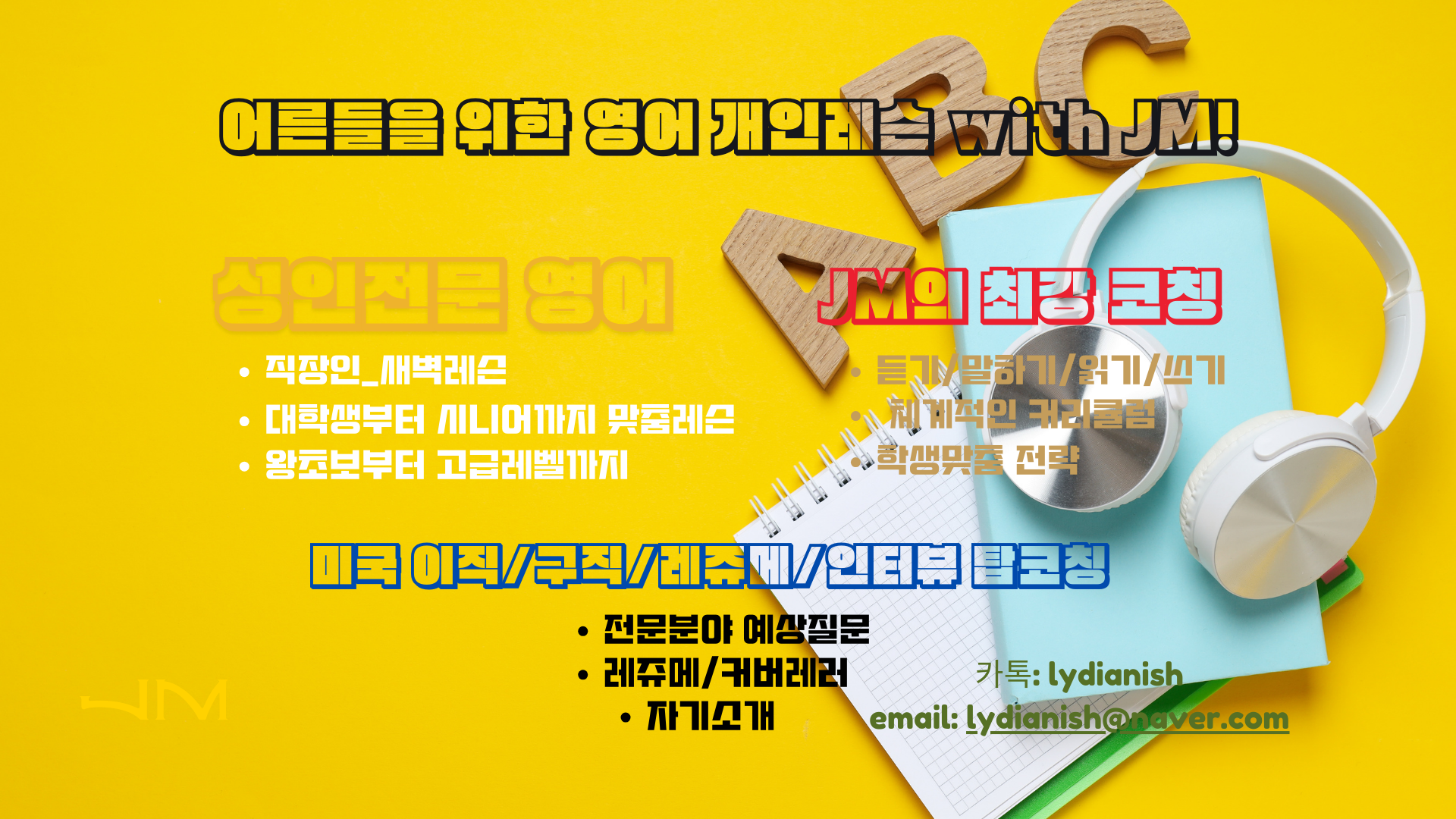 성인 전문 영어 & 미국 이직 코칭 – 어른들을 위한 영어 개인레슨 with JM