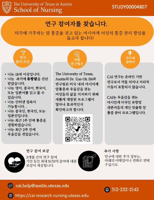 이메일: cai.help@austin.utexas.edu 전화: 512-232-2142 링크: cai.research.nursing.utexas.edu/