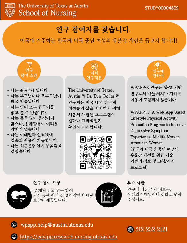 저희는 현재 미국에 거주하는 중년 한인 여성들을 대상으로 우울감을 개선하기 위한 웹/앱 기반 생활 습관 신체 활동 증진 프로그램에 대한 연구를 진행중에 있습니다. 저희는 본 연구에 참여하실 분을 모집하고 있습니다. 1) 40세에서 65세의 한국계 미국 거주 여성으로서 2) 부모님이나 조부모님이 한국인이며 3) 몸을 많이 움직이지 않으나, 신체 활동이 어려운 장애 없으며 4) 영어 또는 한국어를 읽고 쓸 수 있고 5) 인터넷에 접속이 가능하며 6) 최근 2주 안에 우울감을 경험한 분을 저희 연구의 참여자로 모십니다.