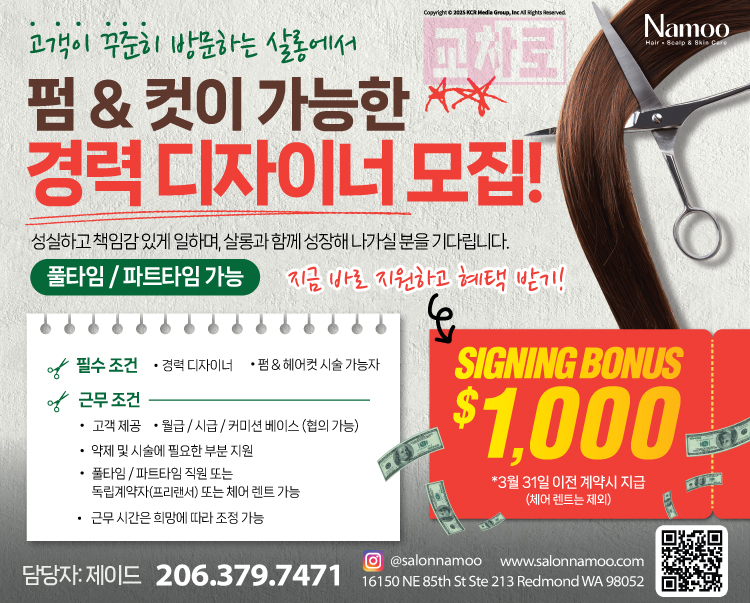 [살롱나무] $1,000 Signing Bonus! 펌&컷 가능한 경력 디자이너 모집합니다 💥