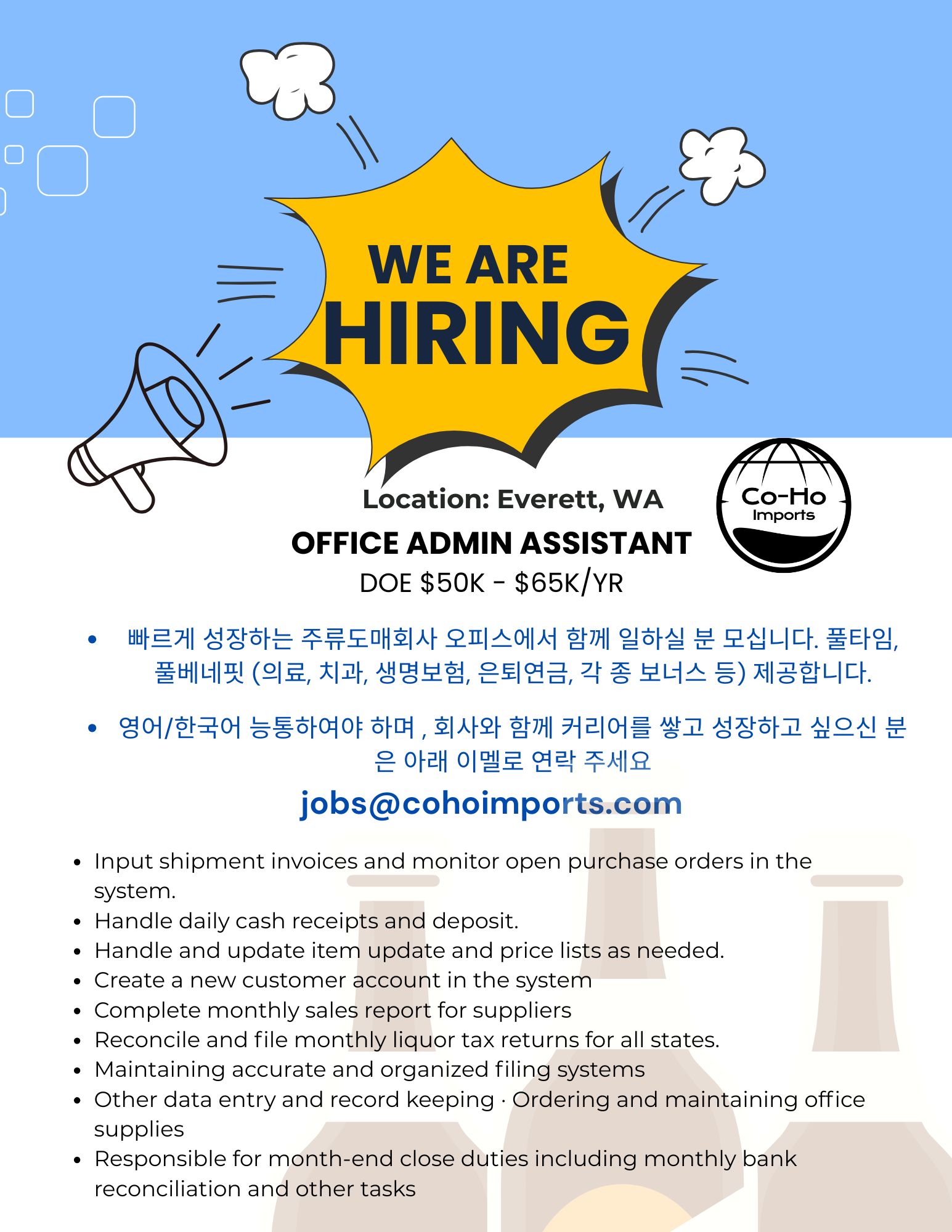 Office Admin Assistant, Accounting – 오피스에서 일 하실 분 모십니다.