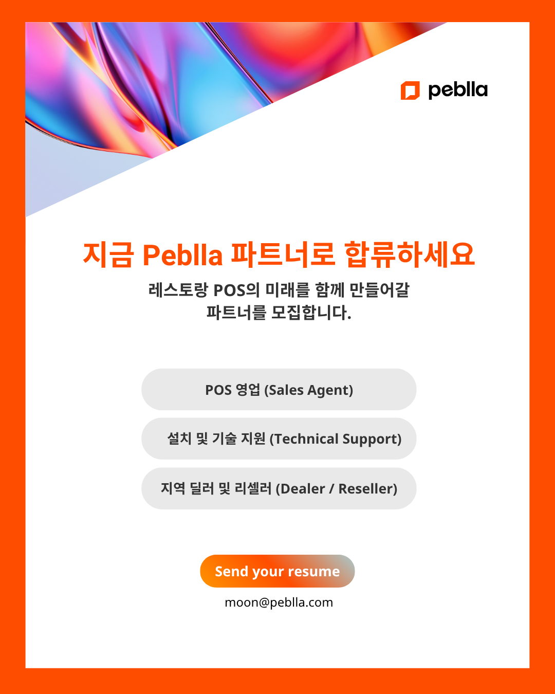 POS의 미래를 함께 만들어갈 분들을 모집합니다.Resume는 moon@peblla.com으로 보내주시면 감사드리겠습니다!