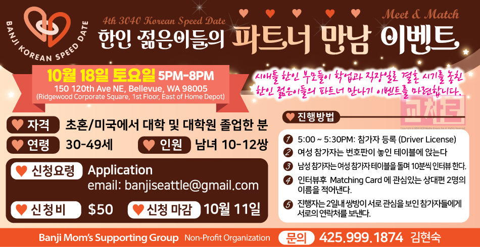 시애틀 한인 부모들이 학업과 직장일로 결혼 시기를 놓친 한인 젊은이들의 파트너 만나기 이벤트를 마련합니다.