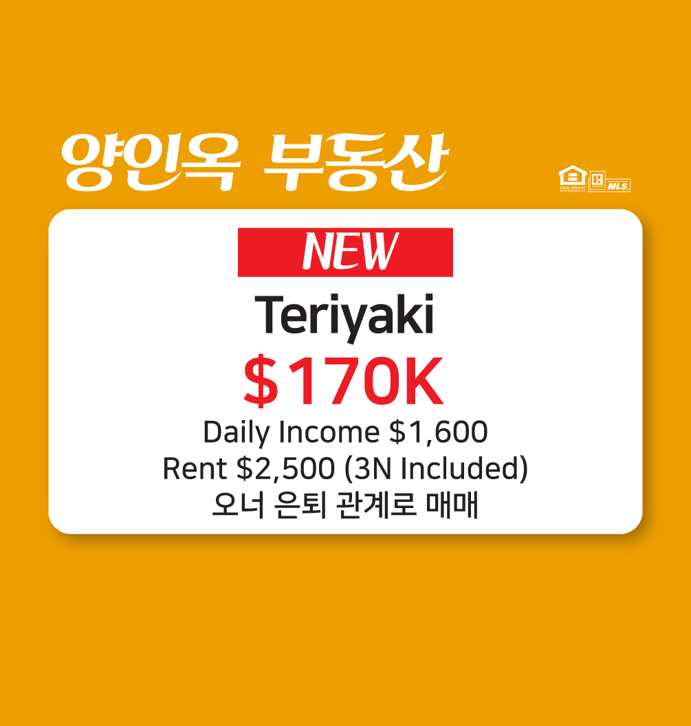 Teriyaki 가격: $170K Daily Income $1,600, Rent $2,500 (3N Included)오너 은퇴 관계로 매매 더 많은 매물 보러 가기> 양인옥 부동산Tel: […]