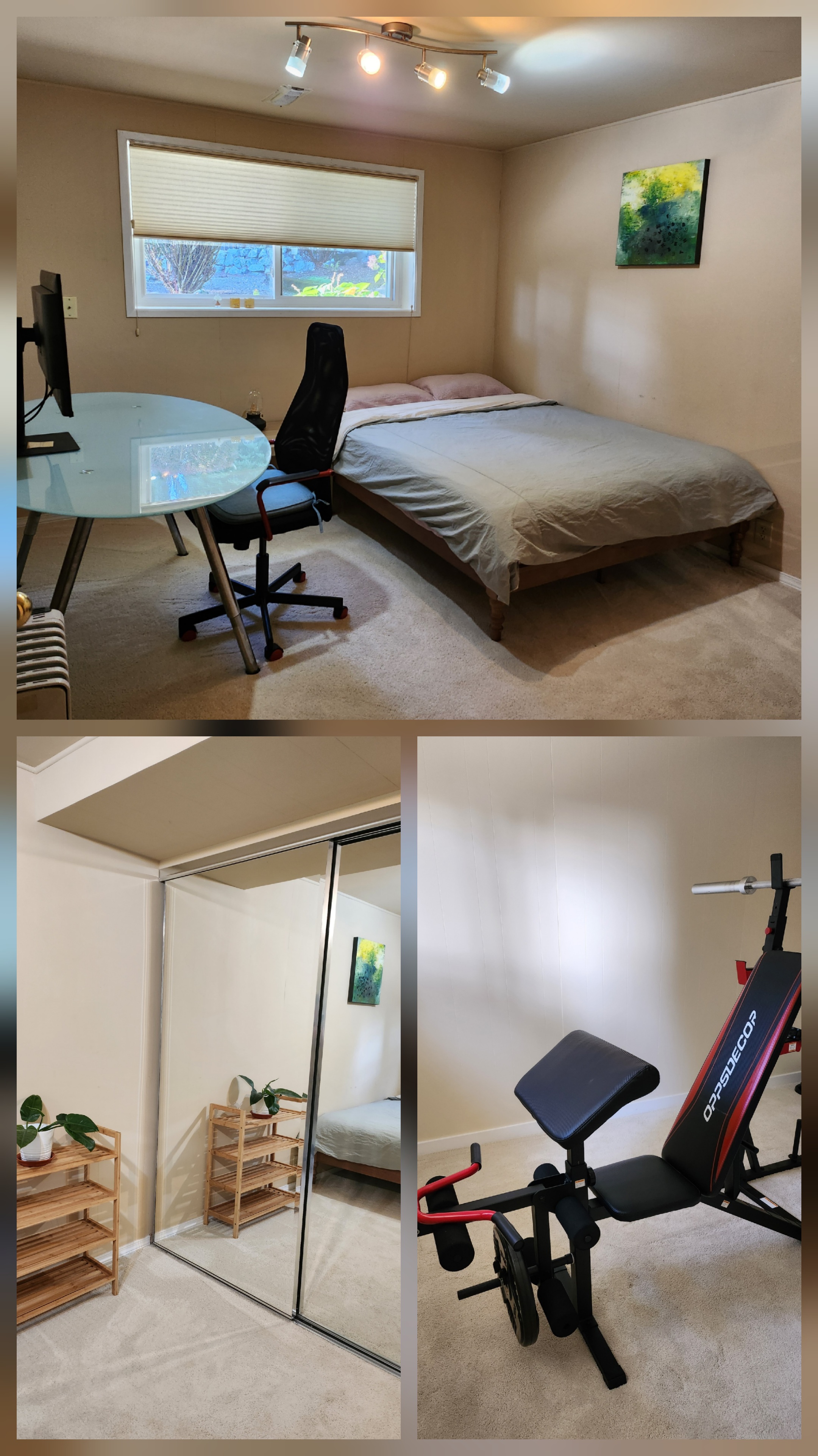 아래층에 있는 넓은 거실공간에는 러닝머신, 실내자전거 같은 운동 기구들이 있어 원하실 때 언제든 운동이 가능합니다. 렌트하실 방 바로 옆방은 비어 있고, 이방에는 또 다른 운동 기구를 이용하시면 됩니다.